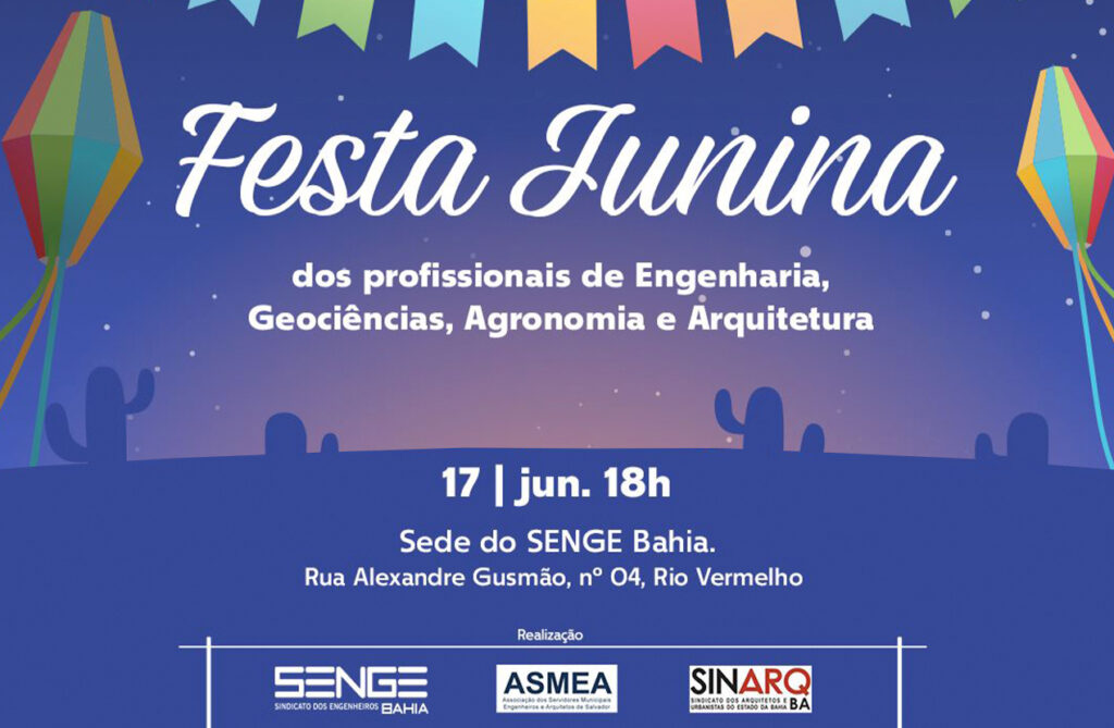 No dia 17 de junho, às 18h, o Sindicato dos Arquitetos e Urbanistas da Bahia (Sinarq-BA), o Sindicato dos Engenheiros da Bahia (Senge-BA) e a Associação dos Servidores Municipais de Engenheiros e Arquitetos de Salvador (Asmea) promovem um encontro para comemorar o São João. A celebração acontece na sede do Senge-BA, na rua Alexandre Gusmão, […]
