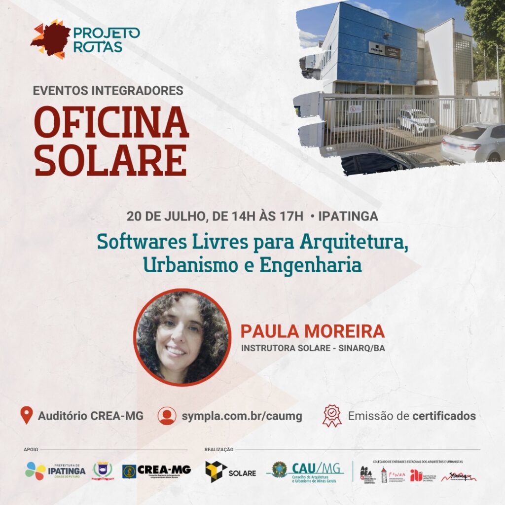 O projeto Softwares Livres para Arquitetura e Engenharia (Solare) desembarca na cidade de Ipatinga (MG) no dia 20 de julho. A partir das 14h, no Auditório da Inspetoria do Crea Minas, será oferecida uma oficina prática dos programas de código aberto ministrada pela professora da iniciativa, Paula Moreira, vice-presidente do Sinarq-BA. O evento faz parte […]