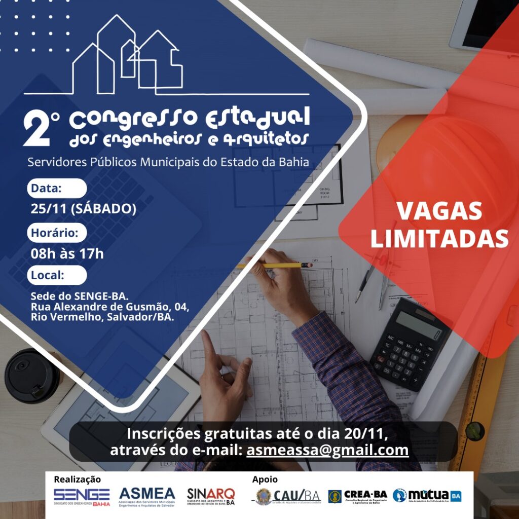 Durante os dias 23 e 24 de maio, Salvador receberá o Fórum de ATHIS. O evento, que irá anteceder a Reunião Anual do Conselho de Representantes (CR), é uma parceria entre Sindicato dos Arquitetos do Estado da Bahia (Sinarq/BA) e Federação Nacional dos Arquitetos e Urbanistas (FNA). As inscrições podem ser realizadas pelo link: https://docs.google.com/forms/d/1GGSLwdQteI7qUCx1vwPSg-fBBayFBt04PVXXX-O5xu8/edit […]